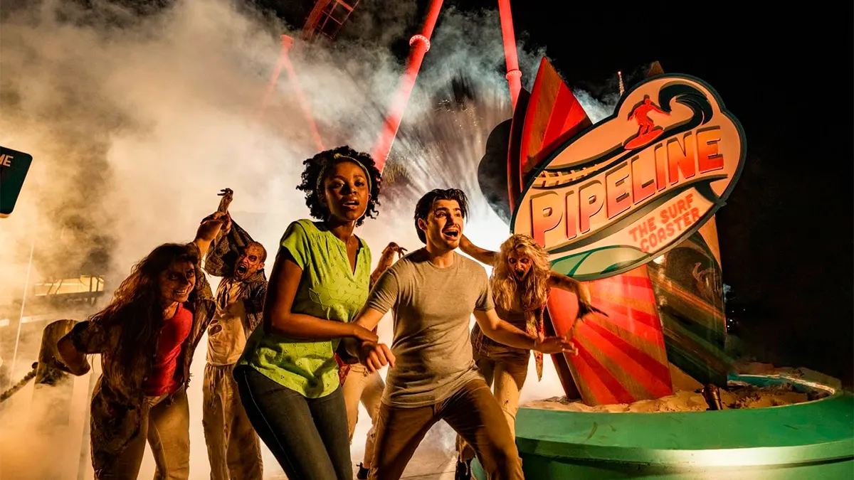 🕸️ E montanhas-russas radicais, como a Mako e a Pipeline, funcionando sob a luz do luar!
