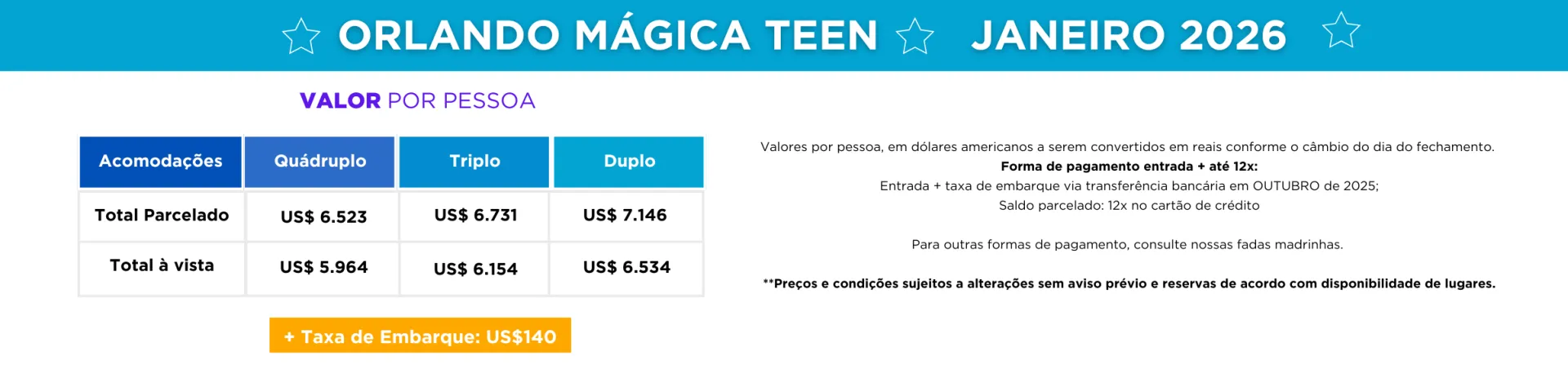 • Taxa de embarque no valor de U$ 140,00 a ser paga junto com a entrada do pacote
